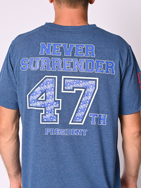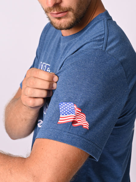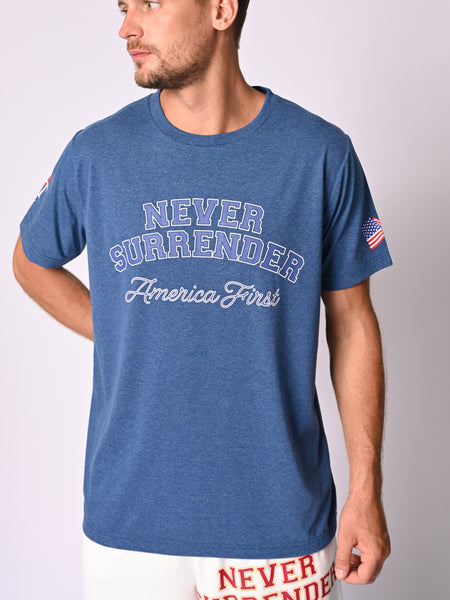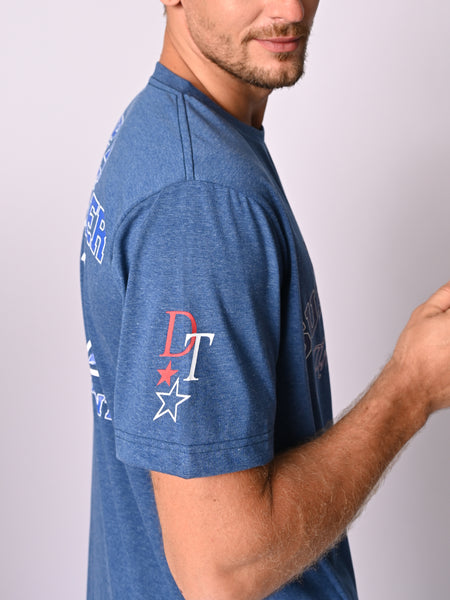 Our signature t-shirt in Blue is adorned with a college-inspired design. Featuring detailed serigraphy at the back that echoes our brand theme, this piece carries the flag of the American pride always in a sporty, comfortable look to your wardrobe.
