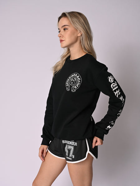 Our Horseshoe Crewneck Sweatshirt Black made with 100% organic cotton. Its iconic design and high quality construction make it a must-have item for any fashion-conscious individual willing to add some edge to their wardrobe.